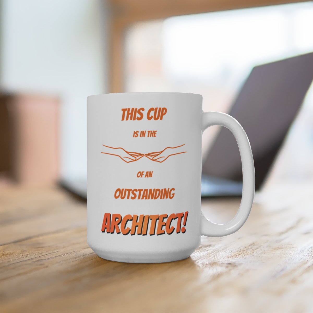 A stylish and inspiring mug for talented architects, featuring the bold statement: ‘This cup is in the hand of an outstanding architect.’ Perfect for sipping coffee while designing your next masterpiece.